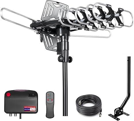 This high-definition Outdoor digital antenna offers an impressive 150-mile reception range, With Our upgrade tv antenna no more need to pay a HUGE bill on TV. Our HD antenna can receive FULL HD Channels like ABC, CBS, NBC, PBC, Fox and so much more. With amplified tv antenna start to access all of the news, sitcoms, kids and sports programs. Featuring a wireless remote controller with a built-in 360-degree motor and super low-noise amplifier, Digital TV Antenna comes with Advanced Smart technology optimize better signal transmission protection, which support super distance reception and 360° reception around your HDTV. Designed for both indoor and outdoor use, this weather-resistant digital TV antenna is built to withstand tough outdoor weather conditions. Whether installed in your attic or outdoors, it ensures exceptional signal reception, making it suitable for various installation environments, especially in rural and suburban areas. Outdoor HDTV antenna supports two TVs simultaneously without the need for a splitter or any special adapters.