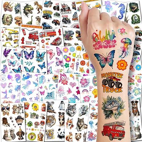 Super adorable and fun temporary tattoos. This tattoo sticker set contains many elements(car and truck, dinosaurs, watercolour animals, butterfly, flower, monster truck, dog, cat, mermaid, hawaii) that kids will like. Add an individual extra touch of fun to a children’s birthday party. Our kids tattoos are safe for your little ones, each tattoo is made of standard quantity material and green paper. These are kid removable temporary tattoos! With these fake tattoos, your kids can deck themselves out with colourful designs that wash or peel off later. Have fun with our collection of removable temporary tattoos for kids. These unique tattoos typically last about 3-6 days. Can be removed with oil, makeup remover, or by scrubbing off. Safe to wear at the beach or in the shower or pool.