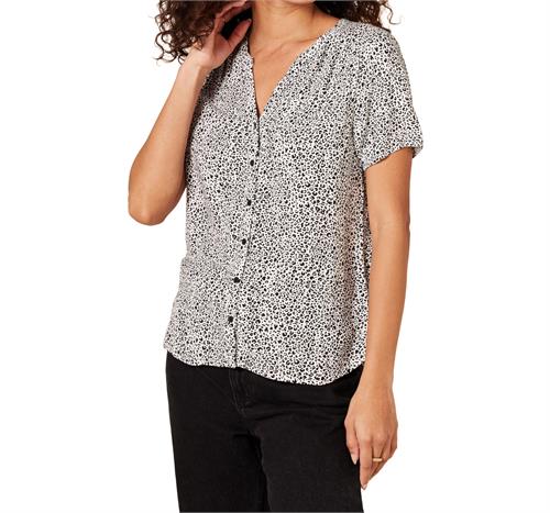 Our non stretch shirt is extremely breathable and lightweight. With a beautiful drape and a soft, smooth finish, this fabric is comfortable and easy to wear all year round. This versatile blouse is a classic wardrobe essential, perfect for work, on the go, or weekend exploring. Features a simple band collar with V-neck, short sleeves, button front closure, and front shirring detail for a feminine look.